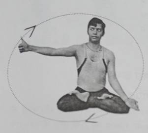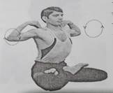 प्रारम्भिक स्थिति में बैठें। दर्शाए की भाँति दायीं टांग को घुटने पर मोड़ें। अपने हाथों को दायीं जांघ के नीचे रखे तथा अंगुलियों को भींच लें या कोहनियों को पकड़ कर बाजू एक दूसरे के ऊपर लेकर जायें। दायां पैर भूमि से ऊपर उठायें। टांग के निचले हिस्से को घुटने पर बड़े दायरे में गोलाकार घुमायें। शरीर का ऊपरी भाग और गर्दन पूरी तरह स्थिर रहें। अब बायीं टांग से पूरी प्रक्रिया दोहरायें। 5 से 10 बार घड़ी की सुईयों की सीधो और फिर विपरीत दिशा में घुमायें। इस आसन से जोड़ों में ऊर्जा का संचार से उन्हें नवजीवन प्राप्त होता है।