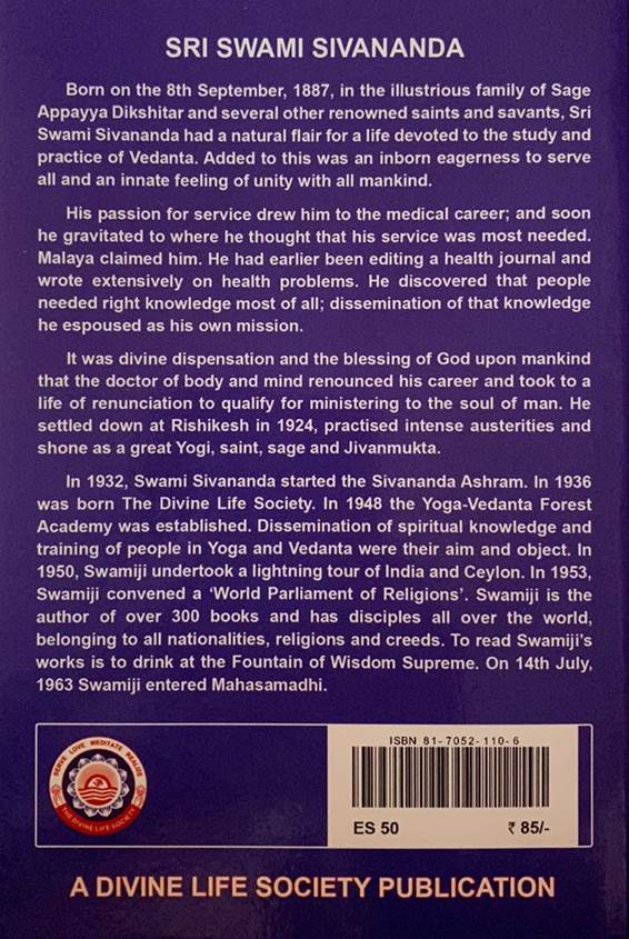Here is found an enumeration of Patanjali's octagonal system which begins with ethical discipline and ends with the final dissolution of individual perception in the cosmic consciousness-whole. Auxiliary notes have been added to this to specify the qualifications required of a Yogic student, the diet to be chosen, the process of harmonising the mental modifications, etc. Added to these is an exposition of the Philosophy of Om which provides a basis for the practice of concentration and meditation.