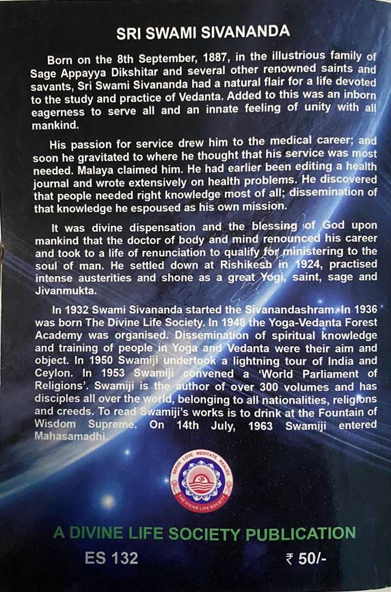 Published by Swami Padmanabhananda for The Divine Life Society, Shivanandanagar, and printed by him at the Yoga-Vedanta Forest Academy Press,