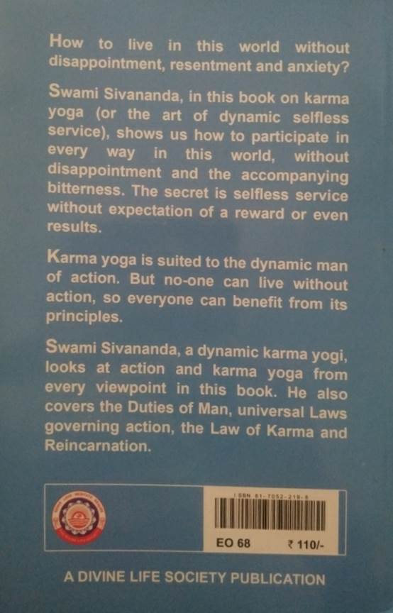 Swami Sivananda, a dynamic karma yogi, looks at action and karma yoga from every viewpoint in this book. He also covers the Duties of Man, universal Laws governing action, the Law of Karma and Reincarnation.