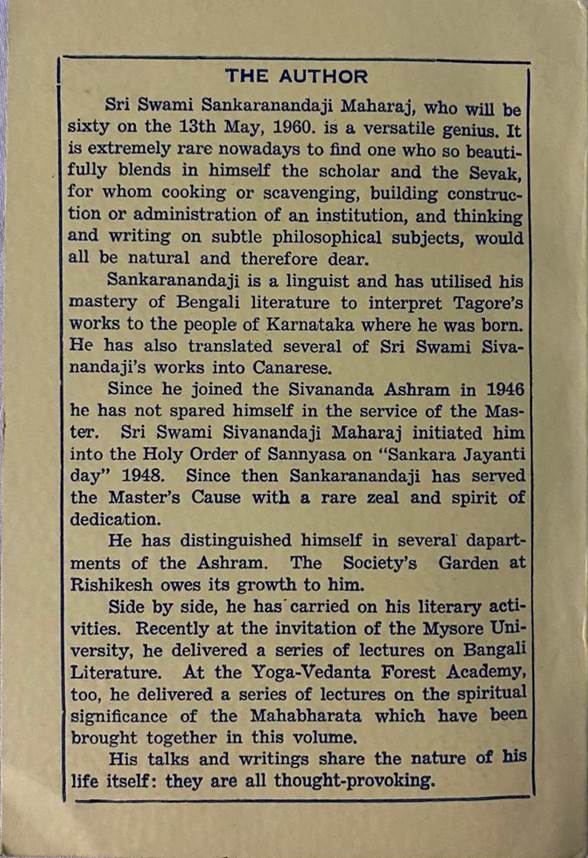 This highly interesting interpretation of the Maha Bharata was given by Sri Swami Sankaranandaji Maharaj, during the course of his lectures given at the Satsangha at the Sivarlandashram, for the benefit of the students of the Yoga-Vedanta Forest Academy. The discourses were very well received: and there was a holy command from His Holiness Sri Swami Sivanandaji Maharaj that they should be published in book-form for the benefit of students abroad.