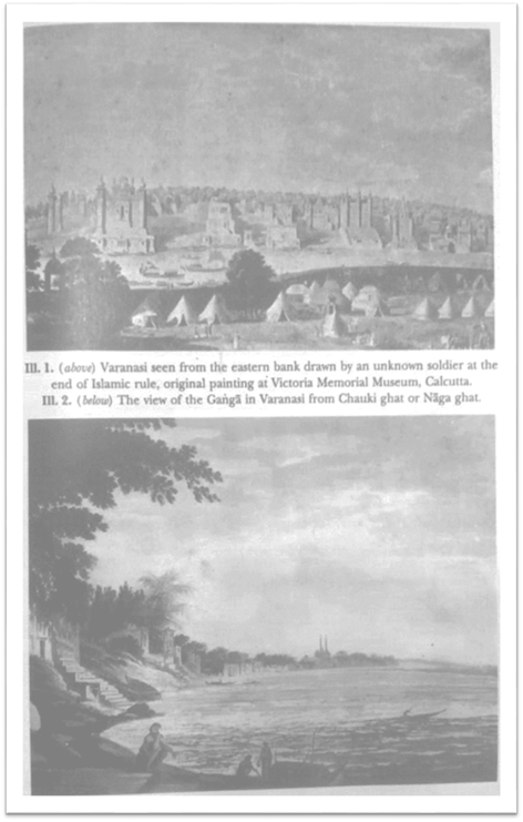 1. इस्लामी शासन के अंत में एक अज्ञात सैनिक द्वारा पूर्वी तट से देखी गई वाराणसी, विक्टोरिया मेमोरियल संग्रहालय, कलकत्ता में मूल पेंटिंग
